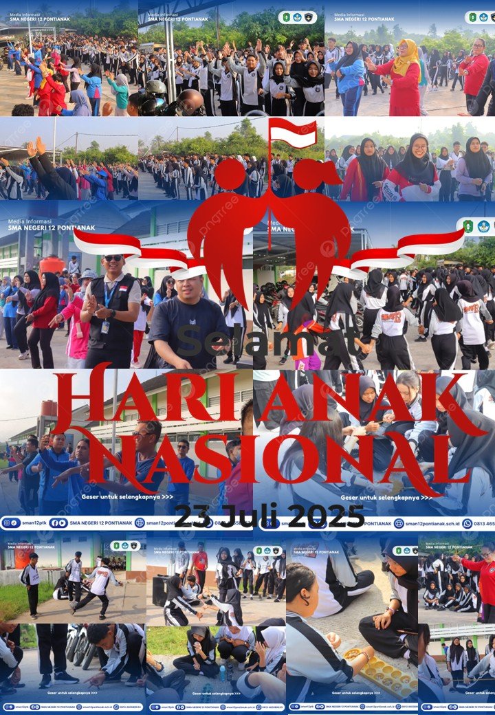IG SMAM 12 PONTIANAKSMAN 12 Pontianak Meriahkan Hari Anak Nasional 2025 dengan Semangat Kreativitas dan Kepedulian Pontianak, 23 Juli 2025 — SMAN 12 Pontianak turut memeriahkan peringatan Hari Anak Nasional (HAN) 2025 dengan menggelar serangkaian kegiatan edukatif, kreatif, dan inspiratif yang melibatkan seluruh siswa, guru, serta staf sekolah. Mengusung tema “Anak Terlindungi, Indonesia Maju”, perayaan ini menjadi momentum untuk menumbuhkan kesadaran akan pentingnya perlindungan, hak, dan peran anak sebagai generasi penerus bangsa. Kegiatan dimulai dengan apel peringatan HAN yang dipimpin langsung oleh Kepala Sekolah, Ibu Ana Sri Sayekti Matofani,S.Pd, M.Pd. Dalam sambutannya, beliau menekankan pentingnya menciptakan lingkungan sekolah yang aman, inklusif, dan mendukung tumbuh kembang anak.“Hari Anak Nasional bukan hanya seremonial, tetapi refleksi bagi kita semua agar terus memberikan ruang bagi anak untuk tumbuh menjadi pribadi yang tangguh, kreatif, dan berkarakter,”Setelah apel, rangkaian acara dilanjutkan dengan berbagai kegiatan menarik, di antaranya:melakukan kegiatan permainan rakyat