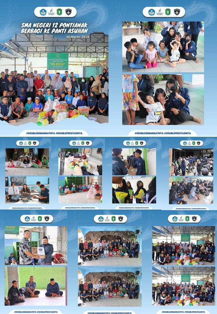 Indahnya Berbagi – SMAN 12 Pontianak di Panti Asuhan Ar Ridho dan Teresa Bakti Berbagi adalah salah satu bentuk kepedulian yang mampu menyentuh hati siapa pun. Hal inilah yang ingin ditanamkan oleh SMAN 12 Pontianak kepada para siswanya melalui kegiatan sosial di bulan suci Ramadan. Tahun ini, sekolah kami mengadakan kunjungan ke dua panti asuhan, yaitu Panti Asuhan Ar Ridho dan Panti Asuhan Teresa Bakti, sebagai bentuk kepedulian terhadap sesama. Kegiatan ini diikuti oleh perwakilan OSIS, beberapa guru pendamping, serta siswa dari berbagai kelas. Sebelum keberangkatan, kami bersama-sama menyiapkan paket sembako, pakaian layak pakai, alat tulis, serta bingkisan spesial untuk anak-anak panti. Semua bantuan ini dikumpulkan dari hasil donasi siswa, guru, dan juga orang tua yang turut mendukung kegiatan mulia ini. Kunjungan pertama dilakukan ke Panti Asuhan Ar Ridho. Suasana hangat langsung terasa saat kami disambut dengan senyum ceria dari adik-adik penghuni panti. Kami mengadakan kegiatan bermain bersama, berbagi cerita, hingga berbuka puasa bersama. Meskipun sederhana, kebersamaan yang terjalin begitu menyentuh hati. Banyak dari kami yang merasa tersentuh melihat semangat mereka menjalani hidup dengan penuh syukur. Setelah itu, kami melanjutkan kegiatan ke Panti Asuhan Teresa Bakti. Di sana, kami kembali disambut dengan ramah. Kami mengadakan kegiatan serupa, lengkap dengan pembacaan doa bersama serta penyerahan bantuan secara simbolis. Kegiatan ini tidak hanya memberi kebahagiaan bagi anak-anak panti, tetapi juga memberikan pelajaran hidup yang berharga bagi kami, para siswa SMAN 12 Pontianak. Melalui kegiatan ini, kami belajar bahwa kebahagiaan tidak selalu datang dari hal besar, tetapi bisa tumbuh dari tindakan kecil yang dilakukan dengan tulus. Kami merasa bersyukur dapat menjadi bagian dari kegiatan ini, karena indahnya berbagi tidak hanya dirasakan oleh mereka yang menerima, tetapi juga oleh mereka yang memberi. Semoga kegiatan seperti ini dapat terus dilakukan di masa mendatang, agar semangat kepedulian dan empati terus tumbuh dalam diri generasi muda.