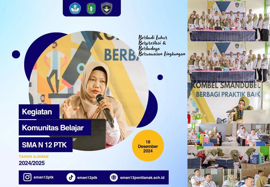 Kombel SMAN 12 Pontianak dilaksanakan setiap bulannya, Komunitas belajar dalam SMAN 12 Pontianak bertujuan untuk mendukung para guru dan tenaga kependidikan untuk meningkatkan kompetensi dengan cara saling berdiskusi dan mengatasi berbagai permasalahan permbelajaran di kelas. Sebagai wadah atau ruang kolaborasi yang ada disekolah, komunitas belajar juga dapat menjadi ajang para guru untuk melatih meningkatkan rasa percaya diri dalam berinovasi dan mengeluarkan ide ide kreatif