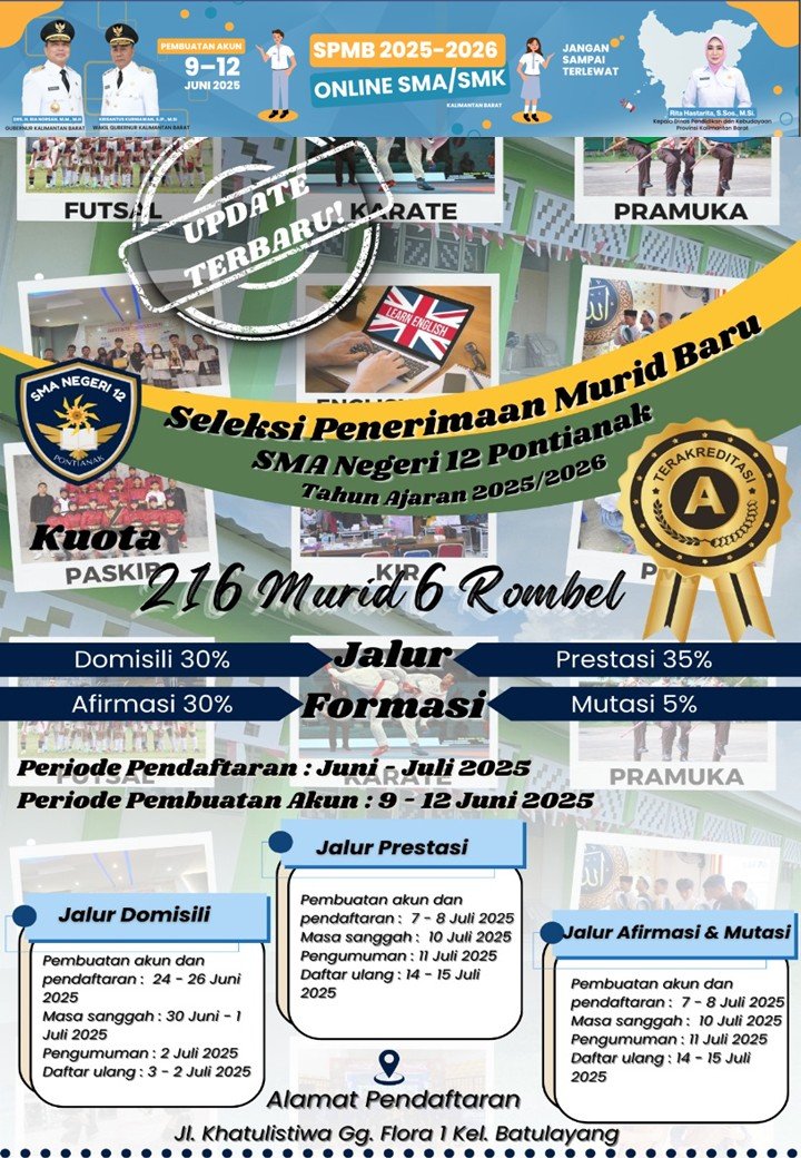 IG SMAM 12 PONTIANAKSMAN 12 Pontianak Sambut Peserta Didik Baru dengan MPLS Ramah Anak Pontianak, awal Juli 2025 — SMA Negeri 12 Pontianak menggelar Masa Pengenalan Lingkungan Sekolah (MPLS) Tahun Pelajaran 2025/2026 dengan semangat luar biasa dan pendekatan yang semakin ramah anak MPLS tahun ini berlangsung selama beberapa hari di awal Juli 2025, sesuai kalender sekolah, dan resmi dinamai sebagai “MPLS Ramah Anak” Kegiatan dirancang tanpa kekerasan, bullying, atau tekanan berlebihan. Semua program menonjolkan suasana edukatif, positif, dan mengedepankan kesejahteraan siswa baru. Dengan tagline MPLS Ramah Anak, sekolah menegaskan komitmen terhadap lingkungan yang inklusif dan mendukung perkembangan anak.Rangkaian Kegiatan Dipandu oleh OSIS dan guru, MPLS menghadirkan berbagai sesi interaktif: Pengenalan tata tertib, kurikulum, dan fasilitas sekolah. Perkenalan ekstrakurikuler dan aktivitas siswa. Kegiatan kebersamaan seperti senam, games edukatif, dan simulasi kegiatan sekolah. Sosialisasi budaya sekolah dan nilai-nilai inklusif.MPLS 2025 di SMAN 12 Pontianak berhasil terselenggara dengan pendekatan yang inovatif dan ramah anak. Kegiatan ini bukan hanya mengenalkan lingkungan sekolah, namun membangun fondasi inklusif dimana siswa baru merasa aman, nyaman, dan termotivasi untuk berkembang